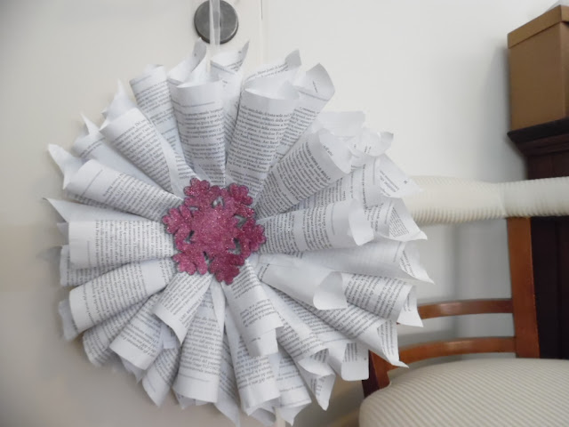 Da un pò di tempo, anch'io volevo realizzare una ghirlanda con un libro, perchè le trovo nella loro semplicità, molto decorative, e d'effetto! - L'unico motivo per cui non l'avevo ancora realizzata, è che proprio mi mancava un libro da sacrificare... Quindi sono andata a spulciare dove mio marito conserva quei librini/dispense che il sole 24ore, (il giornale che lui acquista), spesso regala ai suoi lettori; e così, sono riuscita a trovarne uno che non gli serviva. - Quindi, una volta fatta la ghirlanda, da un cartoncino ho ritagliato il mega cristallo di neve, l'ho decorato con dei brillantini rosa, e gliel'ho applicato al centro. - Stop, finito pronta da utilizzare!!!